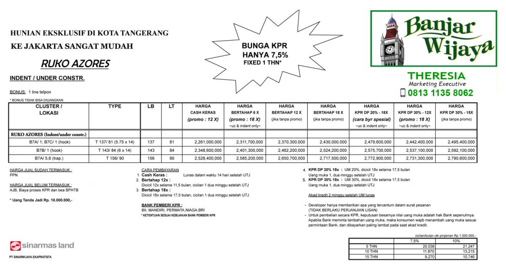 Ruko Azores dengan 2 ½ lantai bergaya minimalis modern yang terletak dikasawan premium kami , dengan luas parkir 15 meter on street dan open parking . lokasi ruko yang sangat trategis karena berada dibolevard banjar wijaya yang menjadi akses tembus menuju tol alam sutra dan planning tol ring 2. Ruko azores telah 90 % SOLD OUT dalam waktu yang singkat. Tersedia ukuran 4.5 x14, 5×14, dan hook (unit terbatas). Temukan hadiah menarik, cash back dan promo cara pembayaran serta diskon khusus untuk pembelian ruko azores.